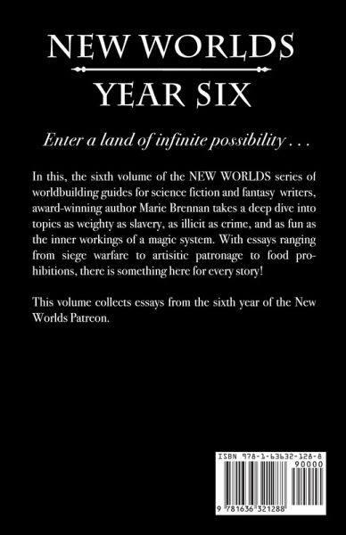 Enter a land of infinite possibility . . . In this, the sixth volume of the NEW WORLDS series of worldbuilding guides for science fiction and fantasy writers, award-winning author Marie Brennan takes a deep dive into topics as weighty as slavery, as illicit as crime, and as fun as the inner workings of a magic system. With essays ranging from siege warfare to artistic patronage to food prohibitions, there is something here for every story! This volume collects essays from the sixth year of the New Worlds Patreon.