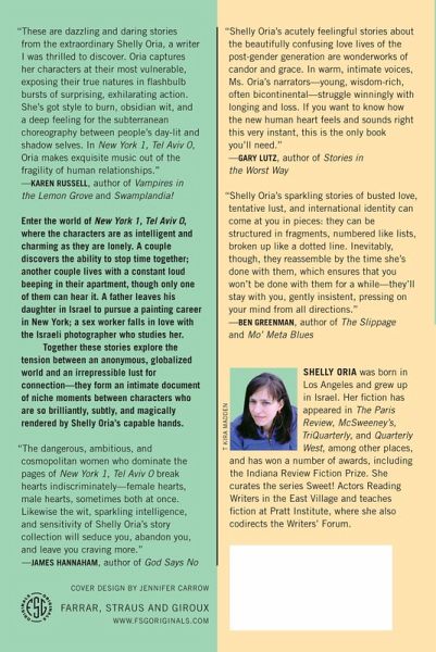 Enter the world of New York 1, Tel Aviv 0, where the characters are as intelligent and charming as they are lonely. A couple discovers the ability to stop time together; another couple lives with a constant loud beeping in their apartment, though only one of them can hear it. A father leaves his daughter in Israel to pursue a painting career in New York; a sex worker falls in love with the Israeli photographer who studies her. Together these stories explore the tension between an anonymous, globalized world and an irrepressible lust for connection-they form an intimate document of niche moments between characters who are so brilliantly, subtly, and magically rendered by Shelly Oria's capable hands.