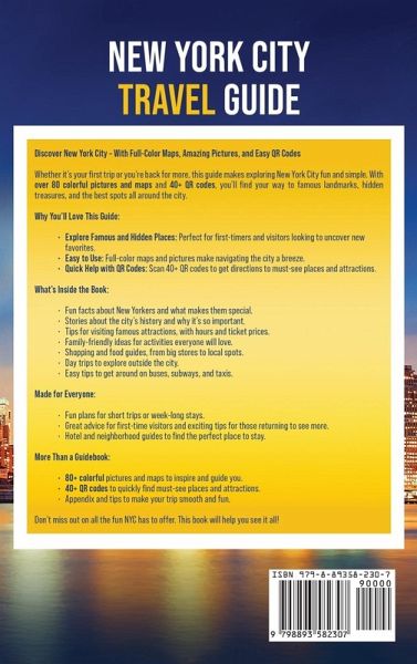 Discover New York City - With Maps, Amazing Pictures, and Easy QR Codes Whether it's your first trip or you're back for more, this guide makes exploring New York City fun and simple. With over 80 pictures and maps and 40+ QR codes, you'll find your way to famous landmarks, hidden treasures, and the best spots all around the city. Why You'll Love This Guide: Explore Famous and Hidden Places: Perfect for first-timers and visitors looking to uncover new favorites. Easy to Use: Maps and pictures make navigating the city a breeze. Quick Help with QR Codes: Scan 40+ QR codes to get directions to must-see places and attractions. What's Inside the Book: Fun facts about New Yorkers and what makes them special. Stories about the city's history and why it's so important. Tips for visiting famous attractions, with hours and ticket prices. Family-friendly ideas for activities everyone will love. Shopping and food guides, from big stores to local spots. Day trips to explore outside the city. Easy tips to get around on buses, subways, and taxis. Made for Everyone: Fun plans for short trips or week-long stays. Great advice for first-time visitors and exciting tips for those returning to see more. Hotel and neighborhood guides to find the perfect place to stay. More Than a Guidebook: 80+ pictures and maps to inspire and guide you. 40+ QR codes to quickly find must-see places and attractions. Appendix and tips to make your trip smooth and fun.