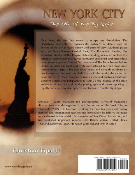 New York, the city that seems to escape any description. The electrifying atmospheres, monuments, architectural details and the skyline of the city in every season and point of view. Mythical places such as Times Square Central Park, The Rockefeller Center, The Brooklyn bridge and The Empire States Building and Ground Zero. 70 shots in color and black and white were selected to Christian Tipaldi, journalist and photographer, World Magazine's director and the author of the book "Across Thailand". New York, la città che sembra sfuggire a qualsiasi descrizione in 70 scatti a colori e in b/n selezionati tra le bellezze architettoniche, dei particolari e delle riprese aeree. Uno sguardo attento e mirato del giornalista e fotografo Christian Tipaldi, direttore del World Magazine e già autore del libro "Across Thailand". Un reportage tra i luoghi di maggiore interesse come Times Square, Central Park, il Rockefeller Center, il ponte di Brooklyn e l'Empire States Building e Ground Zero.