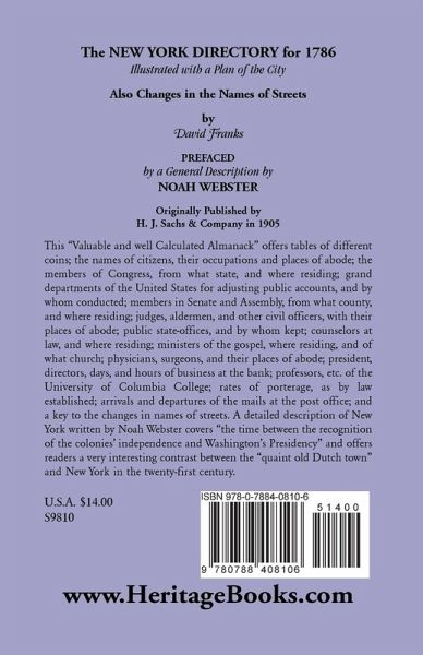 This "Valuable and well Calculated Almanack" offers tables of different coins; the names of citizens, their occupations and places of abode; the members of Congress, from what state, and where residing; grand departments of the United States for adjusting public accounts, and by whom conducted; members in Senate and Assembly, from what county, and where residing; judges, aldermen, and other civil officers, with their places of abode; public state-offices, and by whom kept; counselors at law, and where residing; ministers of the gospel, where residing, and of what church; physicians, surgeons, and their places of abode; president, directors, days, and hours of business at the bank; professors, etc. of the University of Columbia College; rates of porterage, as by law established; arrivals and departures of the mails at the post office; and a key to the changes in names of streets. A detailed description of New York written by Noah Webster covers "the time between the recognition of the colonies' independence and Washington's Presidency" and offers readers a very interesting contrast between the "quaint old Dutch town" and New York in the twenty-first century.