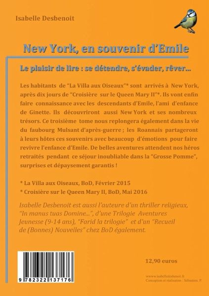 Les habitants de La Villa aux Oiseaux sont arrivés à New York, après dix jours de croisière sur le Queen Mary II. Ils vont enfin faire connaissance avec les descendants d'Emile, l'ami d'enfance de Ginette. Ils découvriront aussi New York et ses nombreux trésors. Ce troisième tome nous replongera également dans la vie du faubourg Mulsant d'après-guerre ; les roannais partageront à leurs hôtes ces souvenirs avec beaucoup d'émotions pour faire revivre l'enfance d'Emile. De belles aventures attendent nos héros retraités pendant ce séjour inoubliable dans la "Grosse Pomme", surprises et dépaysement garantis !La Villa aux Oiseaux, BoD, Février 2015Croisière sur le Queen Mary II, BoD, Mai 2016