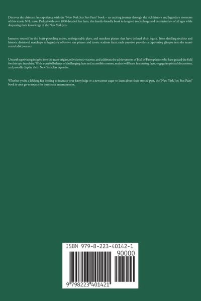 Discover the ultimate fan experience with the "New York Jets Fun Facts" book – an exciting journey through the rich history and legendary moments of this iconic NFL team. Packed with over 1000 detailed fun facts, this family-friendly book is designed to challenge and entertain fans of all ages while deepening their knowledge of the New York Jets. Immerse yourself in the heart-pounding action, unforgettable plays, and standout players that have defined their legacy. From thrilling rivalries and historic divisional matchups to legendary offensive star players and iconic stadium facts, each question provides a captivating glimpse into the team's remarkable journey. Unearth captivating insights into the team origins, relive iconic victories, and celebrate the achievements of Hall of Fame players who have graced the field for this epic franchise. With a careful balance of challenging facts and accessible content, readers will learn fascinating facts, engage in spirited discussions, and proudly display their New York Jets expertise. Whether you're a lifelong fan looking to increase your knowledge or a newcomer eager to learn about their storied past, the "New York Jets Fun Facts" book is your go-to source for immersive entertainment.