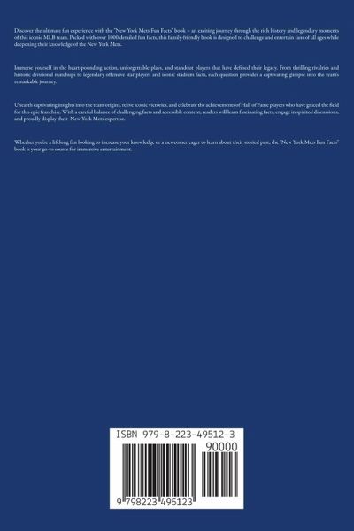 Discover the ultimate fan experience with the "New York Mets Fun Facts" book – an exciting journey through the rich history and legendary moments of this iconic MLB team. Packed with over 1000 detailed fun facts, this family-friendly book is designed to challenge and entertain fans of all ages while deepening their knowledge of the New York Mets. Immerse yourself in the heart-pounding action, unforgettable plays, and standout players that have defined their legacy. From thrilling rivalries and historic divisional matchups to legendary offensive star players and iconic stadium facts, each question provides a captivating glimpse into the team's remarkable journey. Unearth captivating insights into the team origins, relive iconic victories, and celebrate the achievements of Hall of Fame players who have graced the field for this epic franchise. With a careful balance of challenging facts and accessible content, readers will learn fascinating facts, engage in spirited discussions, and proudly display their New York Mets expertise. Whether you're a lifelong fan looking to increase your knowledge or a newcomer eager to learn about their storied past, the "New York Mets Fun Facts" book is your go-to source for immersive entertainment.