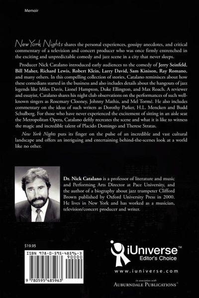 New York Nights shares the personal experiences, gossipy anecdotes, and critical commentary of a television and concert producer who has been firmly entrenched in the exciting and unpredictable comedy and jazz scene in a city that never sleeps. Producer Nick Catalano introduced early audiences to the comedy of Jerry Seinfeld, Bill Maher, Richard Lewis, Robert Klein, Larry David, Sam Kinison, Ray Romano, and many others. In this compelling collection of stories, Catalano reminisces about how these comedians started in the business and also includes details about the hangouts of jazz legends like Miles Davis, Lionel Hampton, Duke Ellington, and Max Roach. A reviewer and essayist, Catalano shares his night club observations on the performances of such well-known singers as Rosemary Clooney, Johnny Mathis, and Mel Tormé and his critical commentary on the writing of luminaries such as Dorothy Parker, H.L. Mencken and Budd Schulberg. For those who have never experienced the excitement of sitting in an aisle seat at the Metropolitan Opera, Catalano deftly recreates the scene and what it is like to witness the magic and incredible talent of Placido Domingo and Therese Stratas. New York Nights puts its finger on the pulse of an incredible and vast cultural landscape and offers an intriguing and entertaining behind-the-scenes look at a world like no other.