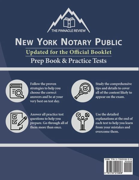 You might be thinking this is just another prep book. What you might not know is that this book was created with you in mind. You see, The Pinnacle Review's unofficial New York Notary Public: Prep Book with 3 Full Practice Tests has consolidated all the notary public laws and legal terms into manageable and easy-to-digest summaries. You'll be able to get the total review of everything that's covered on the exam in practically no time! The New York Department of State's Division of Licensing Services (DLS) was not involved in the creation or production of this product, is not in any way affiliated with The Pinnacle Review, and does not sponsor or endorse this product. The comprehensive Pinnacle Review's New York Notary Public Prep Book covers: New York Notary Public Laws Legal Terms and Rules Test-taking Tips and Strategies 3 FULL practice tests with answers 40+ BONUS True/False Statements