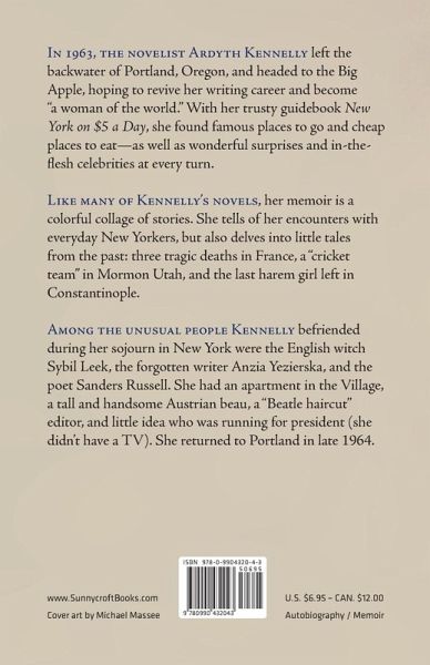 New York on $5 a Day, the last book by the novelist Ardyth Kennelly (1912-2005), is a brief but charming account of her two-year sojourn in New York City (1963-64), where she had gone to try to revive her writing career after the death of her husband a year earlier. Written in 2001, the memoir is a chatty and engaging reminiscence about the unusual people she met in New York, including the English witch and writer Sybil Leek, whom Ardyth asked to cast a spell so she could be a successful writer again (and whose CBS TV appearance Ardyth inadvertently almost spoiled); the aged writer Anzia Yezierska, blind and nearly forgotten but still lively and demanding; the minor poet Sanders Russell, with whom Ardyth explored the city and the World's Fair; the blinded Spanish Civil War veteran Robert Raven, her landlord on West 16th Street; and Raymond Duncan, brother of the famed dancer Isadora Duncan. Ardyth also writes perceptively and vividly about the city as she herself--a well-read but not terribly worldly woman from the West--experienced it. This sparkling center of literary life was a surprising and exciting place for a writer from a relatively unsophisticated town like Portland, Oregon. We learn from Ardyth's letters to her literary friend Freddy Jacobson (included in an appendix) that she reveled in the rich variety of readings, plays, movies, and sightings of famous people--and she loved that you could read the book reviews on Sunday and walk right into Brentano's on Monday and get the books, without having to wait two weeks while they were sent away for. In New York Ardyth had an apartment in Greenwich Village, a tall and handsome Austrian beau, a "Beatle haircut" editor (John Pope), and a dream of living in the famous Dakota apartments. But late in 1964, having had no further success in publishing her books--and feeling that the "alien corn" had at last grown a little too high--she ended her New York idyll and took a bus home to Portland.
