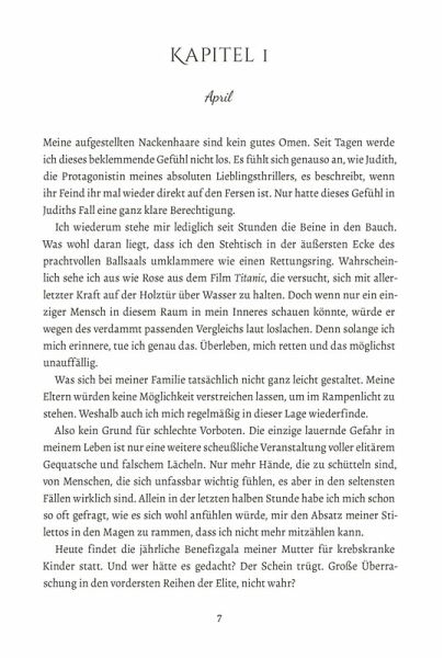 Das New Yorker It-Girl April lebt im Funkeln der High Society. Dabei ist nicht alles Gold, was glänzt. Seit ihre beste Freundin spurlos verschwunden ist, stolpert April über immer mehr Abgründe. Der heiße Clubbesitzer Miles könnte ihr Ausweg sein. Er zieht sie in seinen Bann, raus aus ihren Pflichten und zurück auf die Suche nach ihrer Freundin. Doch auch der Bad Boy hat seine Geheimnisse. Wie gut kennt April ihn schon wirklich? Kann sie ihm vertrauen? Als sie nach der Ankündigung ihres eigenen Todes immer mehr bedrohliche Nachrichten erhält, trifft April eine folgenschwere Entscheidung.