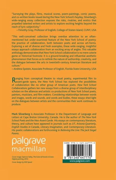 Ranging from conceptual theater to visual poetry the New York School explored the possibilities of collaboration like no other group of American poets. New York School Collaborations gathers essays from a diverse group of scholars on the alliances and artistic co-productions of New York School poets, painters, musicians, and film-makers.