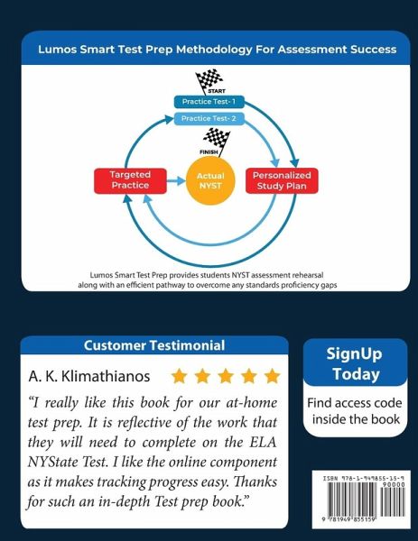 Give Your Child an Edge on the 2026 NYST! Prepare them to excel in the New York state assessments with confidence and ease Designed by NYST experts, the Lumos Learning 7th Grade English Language Arts Practice Workbook is crafted to boost your child's test scores by 10-15 points. Featuring hundreds of practice questions fully aligned with New York State Learning Standards, realistic online practice tests, and personalized learning paths, this workbook is tailored to your child's needs What's New in the 2025-26 Lumos NYST Grade 7 ELA Workbook? Introducing Lumos AI Tutor: While completing practice tasks, your child receives personalized, guided support with step-by-step explanations, helpful hints, and tailored feedback-just like having a teacher at home! Try it today with your workbook. Comprehensive NYST Prep with 7th Grade ELA Practice Questions Expert-Designed Practice: Hundreds of carefully crafted questions aligned with the NYST test, available in both print and digital formats, covering every essential ELA concept. Comprehensive Coverage: The workbook addresses 40+ ELA skills, including Reading: Literature, Reading: Informational Text, and Language. Realistic Practice Tests: Prepare your child with two full-length practice tests that mirror the exact format and difficulty level of the NYST exam, helping them feel confident and ready for test day. Personalized Study Plan: Based on your child's performance in the online practice tests, receive a personalized study plan to guide them through targeted remedial practice using the physical workbook.