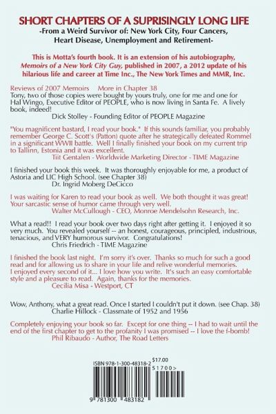 If you can laugh at your ups & downs you will appreciate this book. It is a wannabee comedian's tumultuous ride through life. An uplifting story of how life's struggles sometimes make you stronger and funnier. It's the author's hilarious memoirs redux - first written in 2007 and now expanded years later. It describes his young days in Long Island City and his exciting career at People magazine, The New York Times and MMR, Inc. The author also relates his antics in school, his crazy friends, Army days, surviving cancer, dealing with retirement, and his experiences with several media darlings of publishing and television. If you know NYC, you will love the author's uproarious memories of life in "the concrete jungle".