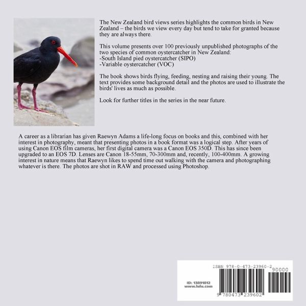 The New Zealand bird views series highlights the common birds in New Zealand - the birds we view every day but tend to take for granted because they are always there. This volume presents over 100 previously unpublished photographs of the two species of common oystercatcher in New Zealand: South Island pied oystercatcher (SIPO) Variable oystercatcher The book shows birds flying, feeding, nesting and raising their young. The text provides some background detail and the photos are used to illustrate the birds' lives as much as possible. Look for further titles in the series.