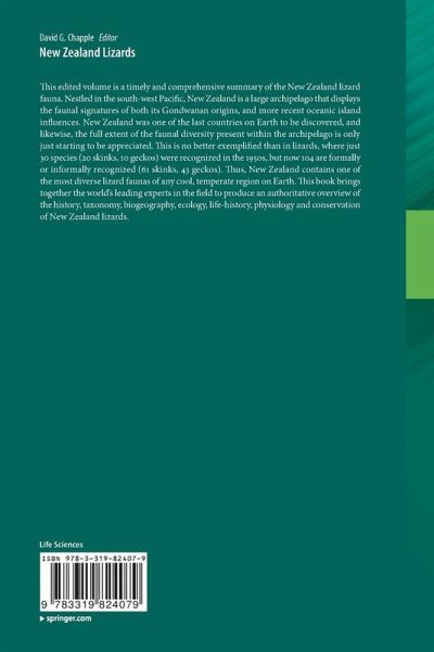 Chapter 1: Introduction (David Chapple).- Chapter 2: New Zealand lizards: a historical perspective (Glenn Shea, University of Sydney, Australia).- Chapter 3: Fossil record of New Zealand lizards (Trevor Worthy, Flinders University, Australia).- Chapter 4: Taxonomy of New Zealand lizards (David Chapple and Rod Hitchmough, NZ Department of Conservation).- Chapter 5: Biogeography of New Zealand lizards (David Chapple and Rod Hitchmough).- Chapter 6: Ecology, diet and habitat use (David Chapple).- Chapter 7: Reproduction, life history and captive breeding (Alison Cree, University of Otago, NZ).- Chapter 8: Parasites, diseases and pathogens of New Zealand lizards (Brett Gartrell, Massey University, NZ).- Chapter 9: Physiology of New Zealand lizards (Alison Cree, and Kelly Hare, Victoria University of Wellington, NZ).- Chapter 10: Sampling techniques for New Zealand lizards (Marieke Lettink, Fauna Finders, Christchurch, NZ).- Chapter 11: Conservation of New Zealand lizards (Dave Towns, Auckland University of Technology/NZ Department of Conservation, and Rod Hitchmough).- Chapter 12: Translocations of New Zealand lizards (Dave Towns, and Kim Miller, University of Melbourne, Australia).- Chapter 13: Lizard conservation in mainland sanctuaries (Nicola Nelson, Victoria University of Wellington, New Zealand).- Chapter 14: The introduced rainbow skink in New Zealand (David Chapple, and Jo Peace, University of Auckland).- Chapter 15: Conclusions and future directions (David Chapple).