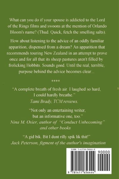 What should you do if your spouse becomes addicted to the Lord of the Rings movies and swoons at the very mention of Orlando Bloom's name? (Thud. Quick, fetch the smelling salts.) How about taking the advice of a strange apparition that reveals itself in a dream? An apparition that looks remarkably like the director of the movies, Peter Jackson, but not quite remarkably enough to prompt legal action. An apparition that recommends touring New Zealand in an effort to prove that its sheep pastures aren't really filled by frolicking Hobbits. Just sheep and the occasional zorbing local. This is the hilarious tale of such a tour, featuring snow capped mountains and turquoise lakes, flightless birds and flying cattle, bungy jumping grannies and the carrot mafia, strange yellow eyes peering up from a road map and hotel receptionists always desperate to know win you are living.