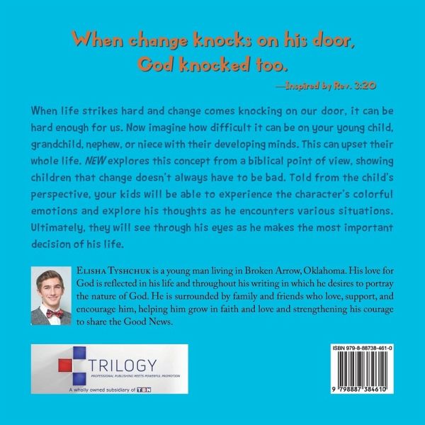When change knocks on his door, God knocked too. When change knocks on his door, God knocked too.-Inspired by Rev. 3:20 When life strikes hard and change comes knocking on our door, it can be hard enough for us. Now imagine how difficult it can be on your young child, grandchild, nephew, or niece with their developing minds. This can upset their whole life. NEW explores this concept from a biblical point of view, showing children that change doesn't always have to be bad. Told from the child's perspective, your kids will be able to experience the character's colorful emotions and explore his thoughts as he encounters various situations. Ultimately, they will see through his eyes as he makes the most important decision of his life.