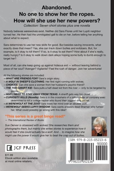 Abandoned. Nobody to show her the ropes. How will she use her new powers? Collection: Seven short stories plus one novella. Nobody believes werewolves exist. Neither did Sara Flores until her Lupiti neighbor turned her. He then had the unmitigated gall to die on her, before telling her anything about what to expect. Sara determines to use her new skills for good. But besides saving innocents, what exactly does that mean? Yes, she can track down bullies and evildoers. But, for example, is it okay to kill them? If so, is it okay to eat them? How about if she's really, really hungry? Is it okay to walk down dark alleys hoping some bully is dumb enough to target her? Most of all, can she keep going up against hideous evil - without leaving behind a piece of her soul? Avenger? Vigilante? Feel the rush of danger. Join her adventures! All the following stories are included: -WHAT ARE FRIENDS FOR? Sara's origin story. -A WOLF IN SHEEP'S CLOTHING. Her first night running with wolves. -CHOICES. Can she save a woman from her husband's psycho friend? -THE TOO-SMART KID. Sara pulls a half-dead kid from the river - only to be targeted by goons. -WHY I NEED TO STAY AWAY FROM TEXAS. A sheriff gets way too close! -CURIOSITY KILLS (Novella): Sara is in the crosshairs of a billion-dollar oil company exec determined to kill a college hacker who found their biggest dirty secret. -A WEREWOLF AT THE ZOO? Sara loses her mind over an abused wolf. -WEREWOLF SEEKS LUPITI WISDOM: Sara wants answers dead Shaman who turned her. What could possibly go wrong with this idea?