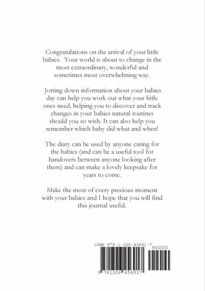 Congratulations on the arrival of your little babies. Your world is about to change in the most extraordinary, wonderful and sometimes most overwhelming way. Jotting down information about your babies day can help you work out what your little ones need, helping you to discover and track changes in your babies natural routines should you so wish. It can also help you remember which baby did what and when! The journal, which is essentially a series of charts, can be used by anyone caring for the babies (and can be a useful tool for handovers between anyone looking after them) and can make a lovely keepsake for years to come.