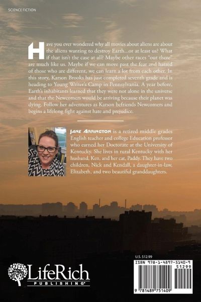 Have you ever wondered why all movies about aliens are about the aliens wanting to destroy Earth...or at least us? What if that isn't the case at all? Maybe other races "out there" are much like us. Maybe if we can move past the fear and hatred of those who are different, we can learn a lot from each other. In this story, Karson Brooks has just completed seventh grade and is heading to Young Writer's Camp in Pennsylvania. A year before, Earth's inhabitants learned that they were not alone in the universe and that the Newcomers would be arriving because their planet was dying. Follow her adventures as Karson befriends Newcomers and begins a lifelong fight against hate and prejudice.