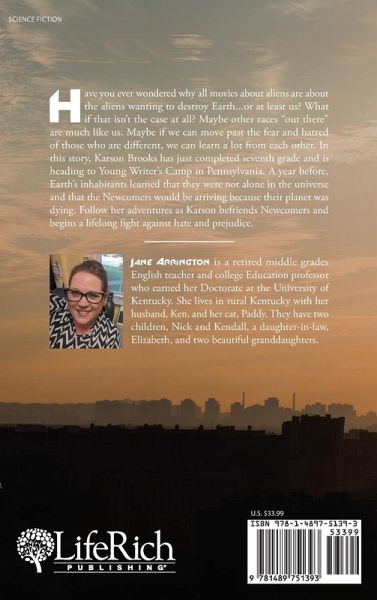 Have you ever wondered why all movies about aliens are about the aliens wanting to destroy Earth...or at least us? What if that isn't the case at all? Maybe other races "out there" are much like us. Maybe if we can move past the fear and hatred of those who are different, we can learn a lot from each other. In this story, Karson Brooks has just completed seventh grade and is heading to Young Writer's Camp in Pennsylvania. A year before, Earth's inhabitants learned that they were not alone in the universe and that the Newcomers would be arriving because their planet was dying. Follow her adventures as Karson befriends Newcomers and begins a lifelong fight against hate and prejudice.
