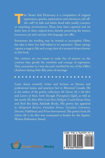 The Newer Kid Dictionary is a compilation of original expressions, queries, explanations and utterances, (all off-the-cuff) by kids and adults faced with usually common or surprising circumstances. These have been captured and set down here in their original form, thereby preserving the humor, innocence, joy and curiosity that language can offer. Sometimes the wording may be twisted or incomplete. Often the idea is there but half-baked in its expression. These sayings capture a stage in life and a snap-shot of a moment frozen forever in this book. The contents are not meant to make fun of anyone: on the contrary they glorify the creativity and courage of expression. They summarize in a way the path travelled by two of the Offers (Authors) during their fifty years of marriage.