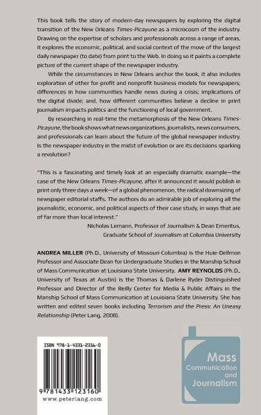 While the circumstances in New Orleans anchor the book, it also includes exploration of other for-profit and nonprofit business models for newspapers; differences in how communities handle news during a crisis; implications of the digital divide; and, how different communities believe a decline in print journalism impacts politics and the functioning of local government.