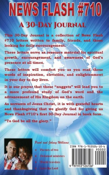 This 30-Day Journal is a collection of News Flash #710 letters written to family, friends, and those looking for daily encouragement. These letters serve as resource material for spiritual growth, encouragement, and awareness of God's presence at all times. These letters will comfort you as you read these words of inspiration, elevation, and enlightenment in your day-to-day lives. It is our prayer that these "nuggets" will lead you to a more profound study of God's word and the advancement of His Kingdom on the earth. As servants of Jesus Christ, it is with grateful hearts and thanksgiving that we glorify God for giving us News Flash #710's first 30-Day Journal in book form. "To God be all the glory."