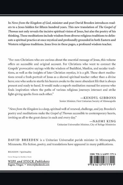 In News from the Kingdom of God, minister and poet David Breeden introduces readers to a Jesus hidden for fifteen hundred years. This new translation of The Gospel of Thomas not only reveals the incisive spiritual vision of Jesus, but also the poetry of his thinking. These meditations include wisdom from diverse religious traditions to delineate a spiritual practice at once mystical and profoundly grounded in both Eastern and Western religious traditions. Jesus lives in these pages, a profound wisdom teacher.