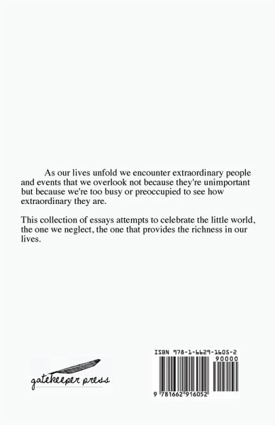 As our lives unfold we encounter extraordinary people and events that we overlook not because they're unimportant but because we're too busy or preoccupied to see how extraordinary they are. This collection of essays attempts to celebrate the little world, the one we neglect, the one that provides the richness in our lives.