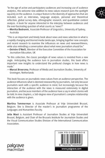 This book focuses on journalistic news values from an audience perspective. The audience influences what is deemed newsworthy by journalists, not only because journalists tell their stories with a specific audience in mind, but increasingly because the interaction of the audience with the news can be measured extensively in digital journalism and because members of the audience have a say in which stories will be told. The first section considers how thinking about news values has evolved over the last fifty years and puts news values in a broader perspective by looking at news consumers' preferences in different countries worldwide. The second section analyses audience response, explaining how audience appreciation and 'clicking' behaviour informs headline choices and is measured by algorithms. Section three explores how audiences contribute to the creation of news content and discusses mainstream media's practice of recycling audience contributions on their own social media channels.