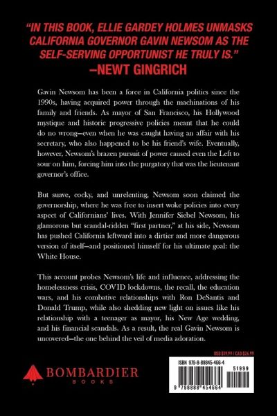 Journalist Ellie Gardey Holmes is about to unmask the real Gavin Newsom. Gavin Newsom has been a force in California politics since the 1990s, having acquired power through the machinations of his family and friends. As mayor of San Francisco, his Hollywood mystique and historic progressive policies meant that he could do no wrong-even when he was caught having an affair with his secretary, who also happened to be his friend's wife. Eventually, however, Newsom's brazen pursuit of power caused even the Left to sour on him, forcing him into the purgatory that was the lieutenant governor's office. But suave, cocky, and unrelenting, Newsom soon claimed the governorship, where he was free to insert woke policies into every aspect of Californians' lives. With Jennifer Siebel Newsom, his glamorous but scandal-ridden "first partner," at his side, Newsom has pushed California leftward into a dirtier and more dangerous version of itself-and positioned himself for his ultimate goal: the White House. This account probes Newsom's life and influence, addressing the homelessness crisis, COVID lockdowns, the recall, the education wars, and his combative relationships with Ron DeSantis and Donald Trump, while also shedding new light on issues like his relationship with a teenager as mayor, his New Age wedding, and his financial scandals. As a result, the real Gavin Newsom is uncovered-the one behind the veil of media adoration.