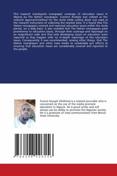 This research investigates newspaper coverage of education issues in Nigeria by The Nation newspaper. Content Analysis was utilized as the research approach/method for this study while coding sheet was used as the research instrument of collecting the needed data. It is found that The Nation newspapers covered and reported education issues within the study period, on a daily basis. It also revealed that The Nation newspapers gave prominence to education issues, through their coverage and reportage on an insignificant scale and that only developing issues on education were reported as they happen with no in-depth reportage of the education issues. Consequently, it was recommended, among other things, that The Nation newspapers and other mass media to sustainably put efforts at ensuring that education issues are considerably covered and reported to the people.