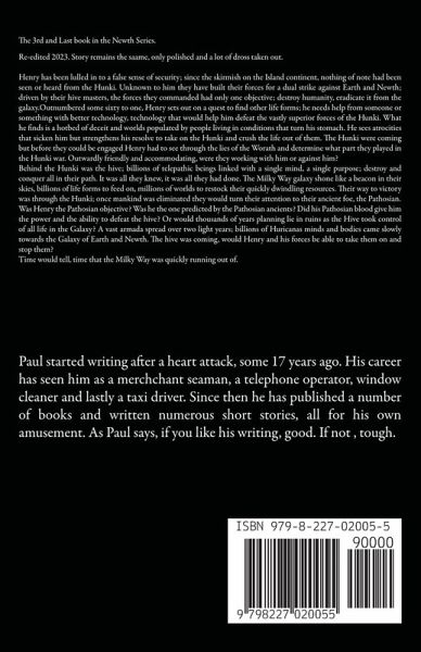 The 3rd and Last book in the Newth Series. Re-edited 2023. Story remains the saame, only polished and a lot of dross taken out. Henry has been lulled in to a false sense of security; since the skirmish on the Island continent, nothing of note had been seen or heard from the Hunki. Unknown to him they have built their forces for a dual strike against Earth and Newth; driven by their hive masters, the forces they commanded had only one objective; destroy humanity, eradicate it from the galaxy.Outnumbered some sixty to one, Henry sets out on a quest to find other life forms; he needs help from someone or something with better technology, technology that would help him defeat the vastly superior forces of the Hunki. What he finds is a hotbed of deceit and worlds populated by people living in conditions that turn his stomach. He sees atrocities that sicken him but strengthens his resolve to take on the Hunki and crush the life out of them. The Hunki were coming but before they could be engaged Henry had to see through the lies of the Worath and determine what part they played in the Hunki war. Outwardly friendly and accommodating, were they working with him or against him? Behind the Hunki was the hive; billions of telepathic beings linked with a single mind, a single purpose; destroy and conquer all in their path. It was all they knew, it was all they had done. The Milky Way galaxy shone like a beacon in their skies, billions of life forms to feed on, millions of worlds to restock their quickly dwindling resources. Their way to victory was through the Hunki; once mankind was eliminated they would turn their attention to their ancient foe, the Pathosian. Was Henry the Pathosian objective? Was he the one predicted by the Pathosian ancients? Did his Pathosian blood give him the power and the ability to defeat the hive? Or would thousands of years planning lie in ruins as the Hive took control of all life in the Galaxy? A vast armada spread over two light years; billions of Huricanas minds and bodies came slowly towards the Galaxy of Earth and Newth. The hive was coming, would Henry and his forces be able to take them on and stop them? Time would tell, time that the Milky Way was quickly running out of.