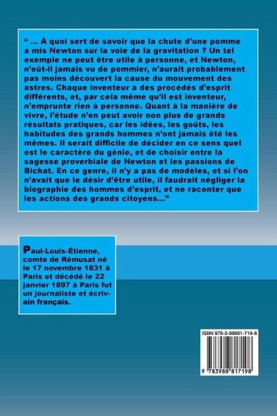 " ... À quoi sert de savoir que la chute d'une pomme a mis Newton sur la voie de la gravitation ? Un tel exemple ne peut être utile à personne, et Newton, n'eût-il jamais vu de pommier, n'aurait probablement pas moins découvert la cause du mouvement des astres. Chaque inventeur a des procédés d'esprit différents, et, par cela même qu'il est inventeur, n'emprunte rien à personne. Quant à la manière de vivre, l'étude n'en peut avoir non plus de grands résultats pratiques, car les idées, les goûts, les habitudes des grands hommes n'ont jamais été les mêmes. Il serait difficile de décider en ce sens quel est le caractère du génie, et de choisir entre la sagesse proverbiale de Newton et les passions de Bichat. En ce genre, il n'y a pas de modèles, et si l'on n'avait que le désir d'être utile, il faudrait négliger la biographie des hommes d'esprit, et ne raconter que les actions des grands citoyens..."