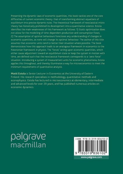 Presenting the dynamic laws of economic quantities, this book tackles one of the core difficulties of current economic theory: that of transforming abstract equations of equilibrium into precise dynamic rules. The theoretical framework of neoclassical micro theory has historically prohibited its development into a quantitative science. Estola identifies the main weaknesses of this framework as follows: 1) Static optimization does not allow for the modelling of time-dependent production and consumption flows; 2) The assumption of optimal behaviours forecloses any understanding of changes in economic quantities, as none will change its optimal behaviour. The author of this title assumes that economic units tend to better their situation where possible. The book demonstrates how this approach leads to an analogous framework in economics to the Newtonian framework in physics. The 'forces' acting upon economic quantities, which either cause adjustment toward an equilibrium state or keep the system in motion with time, are defined such that the neoclassical framework corresponds to a 'zero-force' situation. Introducing a system of measurement units for economic phenomena, Estola applies this throughout, and thereby illuminates a way for microeconomics to meet the minimum requirements of quantitative analysis.