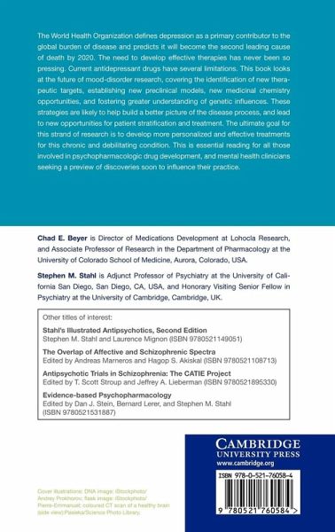 The World Health Organization defines depression as a primary contributor to the global burden of disease and predicts it will become the second leading cause of death by 2020. The need to develop effective therapies has never been so pressing. Current antidepressant drugs have several limitations. This 2010 book looks at the future of mood-disorder research, covering the identification of new therapeutic targets, establishing new preclinical models, new medicinal chemistry opportunities, and fostering greater understanding of genetic influences. These strategies are likely to help build a better picture of the disease process, and lead to new opportunities for patient stratification and treatment. The ultimate goal for this strand of research is to develop more personalized and effective treatments for this chronic and debilitating condition. This is essential reading for all those involved in psychopharmacologic drug development, and mental health clinicians seeking a preview of discoveries soon to influence their practice.