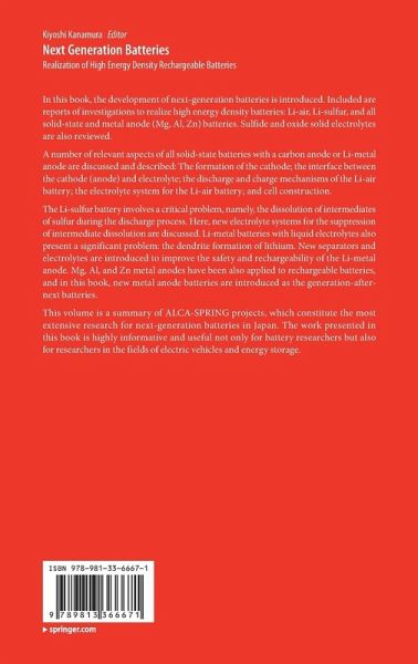 In this book, the development of next-generation batteries is introduced. Included are reports of investigations to realize high energy density batteries: Li-air, Li-sulfur, and all solid-state and metal anode (Mg, Al, Zn) batteries. Sulfide and oxide solid electrolytes are also reviewed.A number of relevant aspects of all solid-state batteries with a carbon anode or Li-metal anode are discussed and described: The formation of the cathode; the interface between the cathode (anode) and electrolyte; the discharge and charge mechanisms of the Li-air battery; the electrolyte system for the Li-air battery; and cell construction. The Li-sulfur battery involves a critical problem, namely, the dissolution of intermediates of sulfur during the discharge process. Here, new electrolyte systems for the suppression of intermediate dissolution are discussed. Li-metal batteries with liquid electrolytes also present a significant problem: the dendrite formation of lithium. New separators and electrolytes are introduced to improve the safety and rechargeability of the Li-metal anode. Mg, Al, and Zn metal anodes have been also applied to rechargeable batteries, and in this book, new metal anode batteries are introduced as the generation-after-next batteries.This volume is a summary of ALCA-SPRING projects, which constitute the most extensive research for next-generation batteries in Japan. The work presented in this book is highly informative and useful not only for battery researchers but also for researchers in the fields of electric vehicles and energy storage.