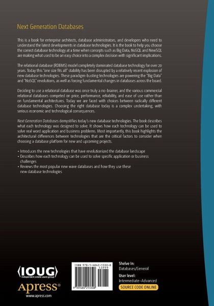 Next Generation Databases demystifies today's new database technologies. The book describes what each technology was designed to solve. It shows how each technology can be used to solve real word application and business problems. Most importantly, this book highlights the architectural differences between technologies that are the critical factors to consider when choosing a database platform for new and upcoming projects.