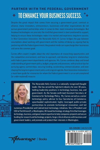 Partner with the Federal government to enhance your business success. Despite the great impact that comes from securing a government contract, many business owners do not Despite the great impact that comes from securing a government grant, contract or alliance, many innovators, entrepreneurs, businesses and other organizations do not pursue government partnerships when it comes to their most innovative technologies. But breakout technologies are precisely the kind that government is best positioned to support, helping to ensure these technologies make it to market and experience long-term success. In Next Generation Innovation, the Honorable Kelly H. Carnes bridges the gap between assumptions about working with government and the realities of doing so, arguing that by partnering with the Federal government, the greatest minds can supercharge their businesses and serve the common good. Carnes offers expert insights about the vital importance of researching opportunities and the competitive environment, and how to approach, and develop long-term relationships with Federal government departments and agencies. Ms. Carnes combines deep and broad understanding of government policy, budget, programs and processes, with practical tips for pursuing agency partnerships, securing funding, accelerating commercialization, and even shaping the long-term government policy and program agenda. Next Generation Innovation is a must-have guide for visionaries for whom the Federal government is an as-yet-unexplored (or under-explored) resource.