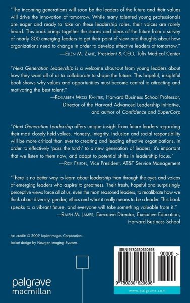 "Next Generation Leadership is a welcome shout-out from young leaders about how they want all of us to collaborate to shape the future. This hopeful, insightful book shows why values and opportunities must become central to attracting and motivating the best talent." - Rosabeth Moss Kanter, Harvard Business School Professor, Director of the Harvard Advanced Leadership Initiative, and author of Confidence and SuperCorp