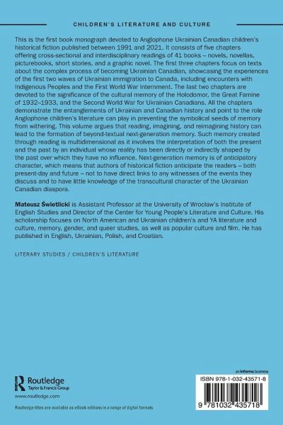 This is the first book monograph devoted to Anglophone Ukrainian Canadian children's historical fiction published between 1991 and 2021. It consists of five chapters offering cross-sectional and interdisciplinary readings of 41 books - novels, novellas, picturebooks, short stories, and a graphic novel. The first three chapters focus on texts about the complex process of becoming Ukrainian Canadian, showcasing the experiences of the first two waves of Ukrainian immigration to Canada, including encounters with Indigenous Peoples and the First World War Internment. The last two chapters are devoted to the significance of the cultural memory of the Holodomor, the Great Famine of 1932-1933, and the Second World War for Ukrainian Canadians. All the chapters demonstrate the entanglements of Ukrainian and Canadian history and point to the role Anglophone children's literature can play in preventing the symbolical seeds of memory from withering. This volume argues that reading, imagining, and reimagining history can lead to the formation of beyond-textual next-generation memory. Such memory created through reading is multidimensional as it involves the interpretation of both the present and the past by an individual whose reality has been directly or indirectly shaped by the past over which they have no influence. Next-generation memory is of anticipatory character, which means that authors of historical fiction anticipate the readers - both present-day and future - not to have direct links to any witnesses of the events they discuss and to have little knowledge of the transcultural character of the Ukrainian Canadian diaspora.