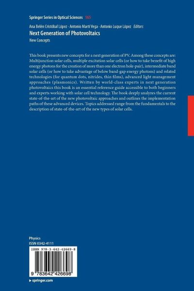 This book presents new concepts for a next generation of PV. Among these concepts are: Multijunction solar cells, multiple excitation solar cells (or how to take benefit of high energy photons for the creation of more than one electron hole-pair), intermediate band solar cells (or how to take advantage of below band-gap energy photons) and related technologies (for quantum dots, nitrides, thin films), advanced light management approaches (plasmonics). Written by world-class experts in next generation photovoltaics this book is an essential reference guide accessible to both beginners and experts working with solar cell technology. The book deeply analyzes the current state-of-the-art of the new photovoltaic approaches and outlines the implementation paths of these advanced devices. Topics addressed range from the fundamentals to the description of state-of-the-art of the new types of solar cells.