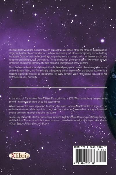 As the author of The Imminent Rise of West Africa, published in 2015, I had the epiphany to write this second book. Immediately, the opportunity arrived. I foresaw the moral imperative and audaciously quantum stepped ahead and developed the duplex leadership and the authoritative capacity and courage to pinpoint the appreciable design of the postmodern twenty-first century massive and smarter commanding, empire-building institution, as they relate to the creation of the new postmodern twenty-first century innovative educational economic blueprint. Besides, as the postmodern twenty-first-century African thinker, transformative entrepreneurial evangelist, and a smarter, industrious, commanding, empire-building institutionalist, my optimum and passionate intent is to revolutionary awaken the future West African superstate regionalism and the future African superb continental economic powerhouse to solidify the impeccable rise of the African bottom billion's economic empire. Globally, the African region is the fastest, overpowering population growth in the world and will still be the largest by the end of this century. The book boldly elaborates the emerging economic-wheel revolution, the new formidable economic structural blueprint for deliberately engineered-route to the on-demand economy and on-demand labor and immediate engagement and enlargement of the service economy in a massive scale and efficiently be able to accommodate the huge rise of the population growth in the West African region and Africa. Conventionally, in the realm of humanity, it takes an unbelievable, tremendous energetic capacity to push the human race forward. It demands a powerfully stronger force. Apparently, the individual-current nations alone in the West African region and Africa are not standardized utility for this astronomical, ambitious, and adventurous humankind undertaking; each lacks the kind of postmodern twenty-first century's marvelous strength or capability to fuel the new necessary economic revolutionary order. However, the individual-current structural nation-states in West Africa and Africa are the preliminary stage for preparing the incarnation of a massive and smarter industrious commanding, empire-building institution for every corner of African society. It is an architectural manipulation of the economic living standard of humanity.