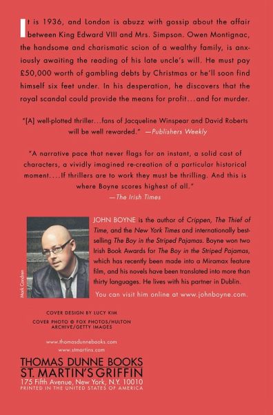 From the bestselling author of The Boy in the Striped Pajamas and "one of the most imaginative and adventurous of the young Irish novelists working today" (Irish Independent) comes John Boyne's Next of Kin. Boyne steps into the drawing rooms and private clubs of the prewar English aristocracy to offer an unobstructed view of a social elite driven by the conflicting desires to uphold tradition and to acquire vast wealth. It is 1936, and London is abuzz with gossip about the affair between Edward VIII and Mrs. Simpson. But the king is not the only member of the aristocracy with a hard decision to make. Owen Montignac, the handsome and charismatic scion of a wealthy family, is anxiously awaiting the reading of his late uncle's will, for Owen has run up huge gambling debts and casino boss Nicholas Delfy has given him a choice: Find 50,000 pounds by Christmas or find yourself six feet under. So when Owen discovers that he has been cut out of the will in favor of his cousin Stella, he finds that even a royal crisis can provide the means for profit, and for murder. Next of Kin vividly captures the spirit of 1930s London, revealing the secrets of the upperclass, complete with gambling, murder, an art heist, and a conspiracy to unseat the new king that could change the future of the country.