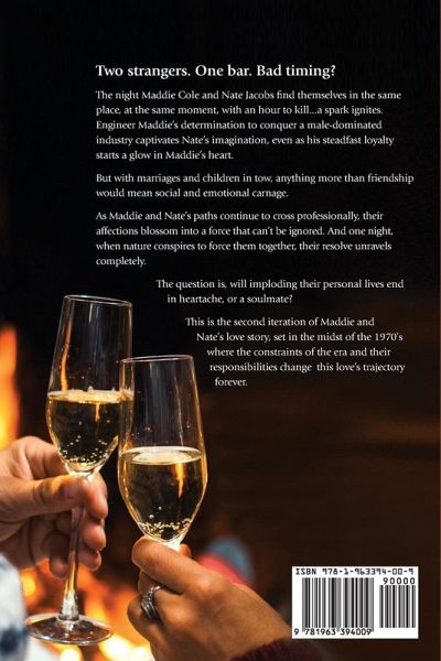 Two strangers. One bar. Bad timing? The night Maddie Cole and Nate Jacobs find themselves in the same place, at the same moment, with an hour to kill...a spark ignites. Engineer Maddie's determination to conquer a male-dominated industry captivates Nate's imagination, even as his steadfast loyalty starts a glow in Maddie's heart. But with marriages and children in tow, anything more than friendship would mean social and emotional carnage. As Maddie and Nate's paths continue to cross professionally, their affections blossom into a force that can't be ignored. And one night, when nature conspires to force them together, their resolve unravels completely. The question is, will imploding their personal lives end in heartache, or a soulmate? This is the second iteration of Maddie and Nate's love story, set in the midst of the 1970's where the constraints of the era and their responsibilities change this love's trajectory forever.