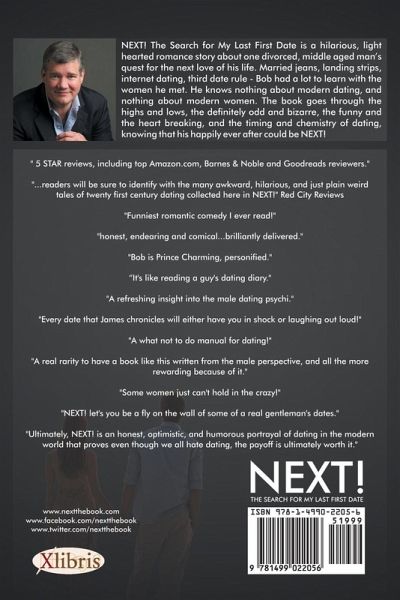 "…readers will be sure to identify with the many awkward, hilarious, and just plain weird tales of twenty first century dating collected here in NEXT!" Red City Reviews 5 Star reviews, including top Amazon.com, Barnes and Noble and Goodreads.com reviewers. "Bob is Prince Charming, personified." "Finally, a book on dating from a man’s perspective, as warped as that may be." Cathy (Literary Executive) "Funniest romance book I ever read." Jill "Some women just can't hide crazy!" "You’re the only guy I know who could have two stories about dogs eating your clothes on dates!" Jenny "When did modern dating get so complicated, and funny?" "Ultimately, NEXT! Is an honest, optimistic, and humorous portrayal of dating in the modern world that proves that even though we all hate dating, the payoff is ultimately worth it." Red City Reviews "This book is hilarious…it would make a great movie." Greg (Film Executive) "A refreshing insight to the male dating psychi." Sharon (Psychologist) NEXT!