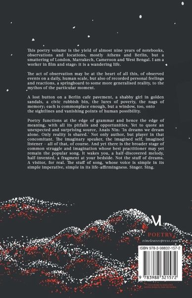 Poetry by the screenwriter of 'Hideous Kinky' starring Kate Winslet, and script editor of Jane Campion's 'The Piano'. This poetry volume is the yield of almost nine years of notebooks, observations and locations, mostly Athens and Berlin, but a smattering of London, Marrakech, Cameroon and West Bengal. I am a worker in film and stage: it is a wandering life. The act of observation may be at the heart of all this, of observed events on a daily, human scale, but also of recorded personal feelings and reactions, a springboard to some more generalised reality, to the mythos of the particular moment. A lost button on a Berlin cafe pavement, a shabby girl in golden sandals, a civic rubbish bin, the lures of poverty, the nags of memory; each is commonplace enough, but a window, too, onto the sightlines and vanishing points of human possibility. Poetry functions at the edge of grammar and hence the edge of meaning, with all its pitfalls and opportunities. Yet to quote an unexpected and surprising source, Anais Nin: 'In dreams we dream alone. Only reality is shared.' Not only author, but player in that concomitant. The imaginary speaker, the imagined self, imagined listener - all of that, of course. And yet there is the broader stage of common struggle and imagination whose best practitioner may yet remain the popular song. It wakes you, a half-discovered melody, half-invented, a fragment at your bedside. Not the stuff of dreams. A visitor, for real. The stuff of song, whose voice is simple in its simple imperative, simple in its life-affirmingness. Singer. Sing. For fans of Catullus, Tu Fu, Emily Dickinson, Anna Akhmatova, Berthold Brecht, Jacques Prevert, and Robert Graves.