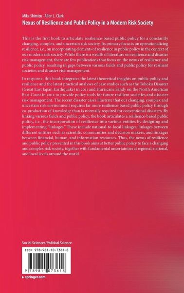 In response, this book integrates the latest theoretical insights on public policy and resilience and the latest practical analyses of case studies such as the Tohoku Disaster (Great East Japan Earthquake) in 2011 and Hurricane Sandy on the North American East Coast in 2012 to provide policy tools for future resilient societies and disaster risk management. The recent disaster cases illustrate that our changing, complex and uncertain risk environment requires far more resilience-based public policy through co-production of knowledge than is normally required for conventional disasters. By linking various fields and public policy, the book articulates a resilience-based public policy, i.e., the incorporation of resilience into various entities by designing and implementing "linkages." These include national-to-local linkages, linkages between different entities such as scientific communities and decision makers, and linkages between financial, human, and information resources. Thus, the nexus of resilience and public policy presented in this book aims at better public policy to face a changing and complex risk society, together with fundamental uncertainties at regional, national, and local levels around the world.