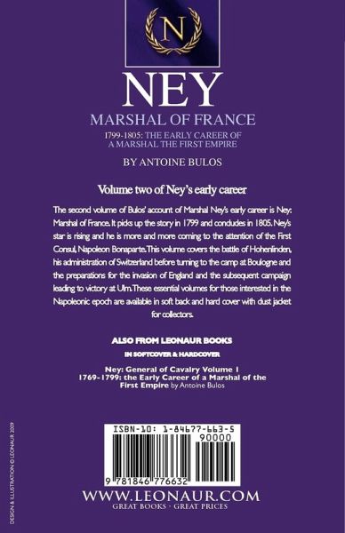 Volume two of Ney's early career The second volume of Bulos' account of Marshal Ney's early career is Ney: Marshal of France. It picks up the story in 1799 and concludes in 1805. Ney's star is rising and he is more and more coming to the attention of the First Consul, Napoleon Bonaparte. This volume covers the battle of Hohenlinden, his administration of Switzerland before turning to the camp at Boulogne and the preparations for the invasion of England and the subsequent campaign leading to victory at Ulm. These essential volumes for those interested in the Napoleonic epoch are available in soft back and hard cover with dust jacket for collectors.