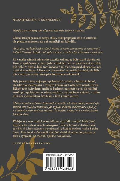 Nebyly jsme stvöeny tak, abychom ily nae ivoty v osam¿ní. ádná d¿ív¿jí generace nebyla nikdy tolik propojená jako ta sou¿asná, ale p¿esto se mnoho z nás cítí osam¿leji ne kdy d¿ív. A¿ u jsme svobodné nebo vdané, mladé ¿i starí, introvertní ¿i extrovertní, bohaté ¿i chudé, kadá z nás byla stvöena s touhou být milovaná a poznaná. U v rajské zahrad¿ od samého zäátku vidíme, e B¿h stvöil ¿lov¿ka pro ivot ve spole¿enství s ním a jedni s druhými. ít ve spole¿enství ale m¿e být t¿ké. V dnení dob¿ tráví mnoho z nás více ¿asu p¿ed obrazovkou ne s p¿áteli ¿i rodinou. Máme sice "kamarády" na sociálních sítích, ale B¿h nás stvöil pro vztahy, které p¿esahují hranice obrazovek. Byly jsme stvöeny nejen pro spole¿enství a vztahy s druhými obecn¿, ale také pro spole¿enství v r¿zných konkrétních oblastech naich ivot¿. B¿hem této ¿ty¿týdenní studie se budeme soust¿edit na to, jak nás B¿h stvöil pro spole¿enství se sebou samým, s naí rodinou a p¿áteli, s naím místním spole¿enstvím k¿es¿an¿, a také s tímto sv¿tem. Moná se práv¿ te¿ cítíte izolovan¿ a osam¿le, ale ivot takový nemusí být. B¿hem této studie se nau¿íme, jak vypadá biblické spole¿enství, a jak jej v naich ivotech m¿eme rozvíjet. Osam¿lost nemusí mít v naem ivot¿ kone¿né slovo. P¿idejte se v této studii k nám! M¿ete si pöídit studijní deník (bu¿ digitáln¿ ke staení nebo k zakoupení v tit¿né form¿) a sledovat nae sociální sít¿, kde naleznete povzbuzení ke kadodennímu studiu Boího Slova. Plán ¿tení k této studii spole¿n¿ s kadodenním zamylením je také k vyhledání na mobilní aplikaci YouVersion.