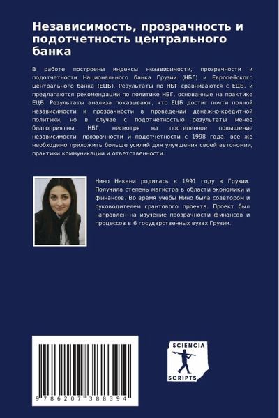 V rabote postroeny indexy nezawisimosti, prozrachnosti i podotchetnosti Nacional'nogo banka Gruzii (NBG) i Ewropejskogo central'nogo banka (ECB). Rezul'taty po NBG srawniwaütsq s ECB, i predlagaütsq rekomendacii po politike NBG, osnowannye na praktike ECB. Rezul'taty analiza pokazywaüt, chto ECB dostig pochti polnoj nezawisimosti i prozrachnosti w prowedenii denezhno-kreditnoj politiki, no w sluchae s podotchetnost'ü rezul'taty menee blagopriqtny. NBG, nesmotrq na postepennoe powyshenie nezawisimosti, prozrachnosti i podotchetnosti s 1998 goda, wse zhe neobhodimo prilozhit' bol'she usilij dlq uluchsheniq swoej awtonomii, praktiki kommunikacii i otwetstwennosti.